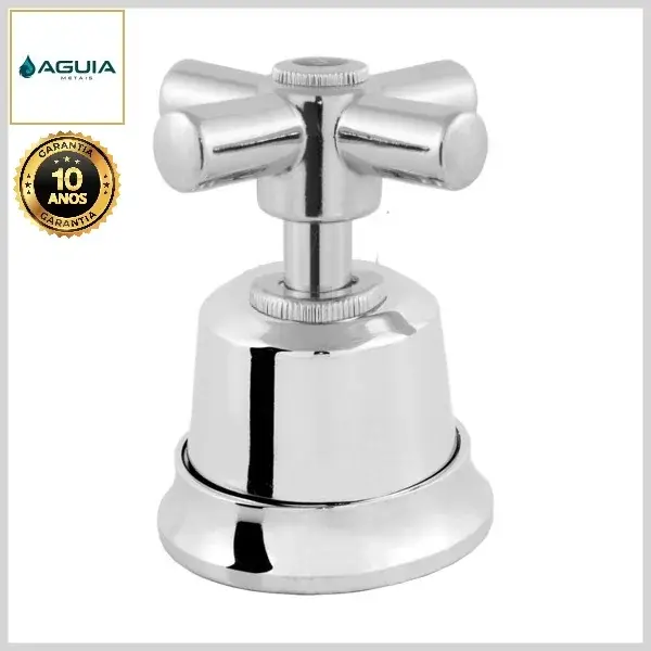 Os acabamentos de registros da Águia Metais são compostos por canoplas e volantes, produzidos com ligas metálicas e plásticos de engenharia, com acabamento cromado.