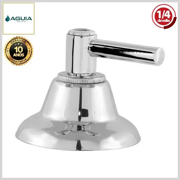Os acabamentos de registros da Águia Metais são compostos por canoplas e volantes, produzidos com ligas metálicas e plásticos de engenharia, com acabamento cromado brilhante.