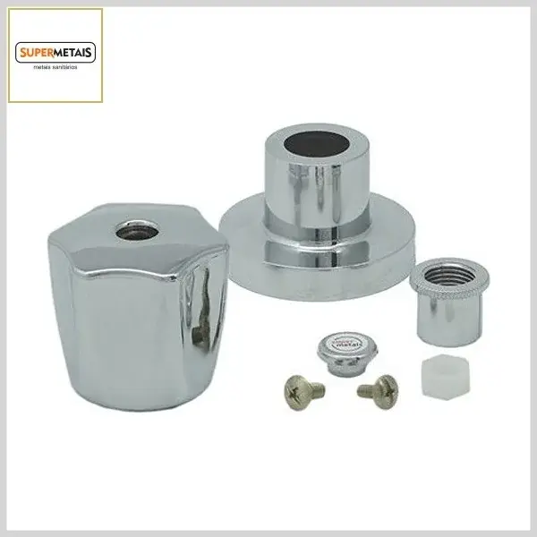 Os acabamentos de registros da Super Metais são compostos por canoplas e volantes, produzidos com ligas metálicas e plásticos de engenharia, com acabamento cromado brilhante.