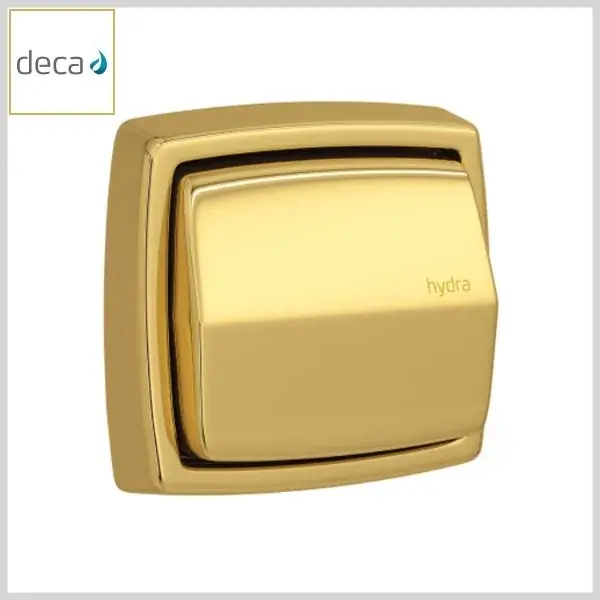 Produto com acionador e canopla em metal dourado (gold) brilhante, sendo indicado para acabamento e acionamento de bases de válvulas de descarga da linha original HydraMax (1.1/4 e 1.1/2pol).