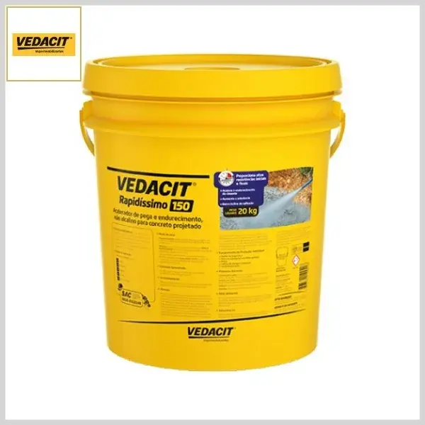 Vedacit Rapidíssimo 150 é um aditivo acelerador de pega não alcalino, que acelera a pega e o endurecimento do concreto, proporcionando altas resistências iniciais e possibilitando grande aderência das camadas do concreto projetado às superfícies e baixos índices de reflexão.