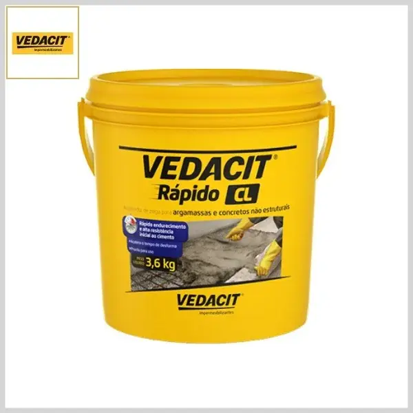 Vedacit Rápido CL é um acelerador de pega para argamassas e concretos não estruturais. Sua fórmula proporciona rápido endurecimento e resistências iniciais ao cimento utilizado nas argamassas e concretos.