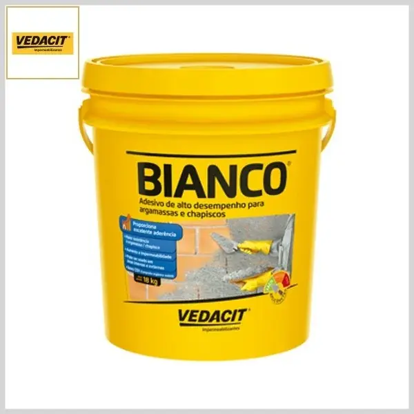 Bianco é uma resina sintética adesiva, de alto desempenho, que proporciona excelente aderência das argamassas aos mais diversos substratos. Confere maior plasticidade, aumenta a impermeabilidade e evita a retração das argamassas. Pode ser usado em áreas externas e internas ou sujeitas à umidade.