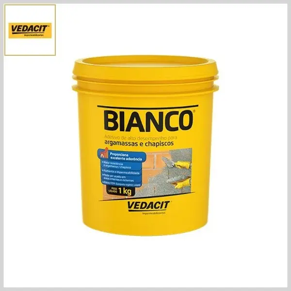 Bianco é uma resina sintética adesiva, de alto desempenho, que proporciona excelente aderência das argamassas aos mais diversos substratos. Confere maior plasticidade, aumenta a impermeabilidade e evita a retração das argamassas. Pode ser usado em áreas externas e internas ou sujeitas à umidade.
