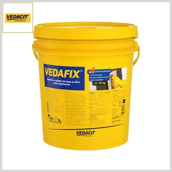 Vedafix é um adesivo e selador de base acrílica, compatível com cimento e cal. Tem ação adesiva, o que aglutina as partículas do cimento e dos agregados, proporcionando melhor trabalhabilidade e maior aderência da argamassa aos substratos. Evita fissura de retração e aumenta a resistência ao desgaste.