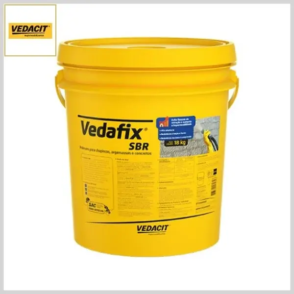 Vedafix SBR é um polímero sintético que adicionado ao chapisco, argamassas ou concreto, modifica suas características, proporcionando grande aderência aos mais diversos substratos. Confere boa trabalhabilidade e evita fissuras de retração, além de aumentar consideravelmente a impermeabilidade, as resistências à tração e à flexão, a resistência mecânica à compressão, modificando o módulo de deformação, desgaste e impactos.