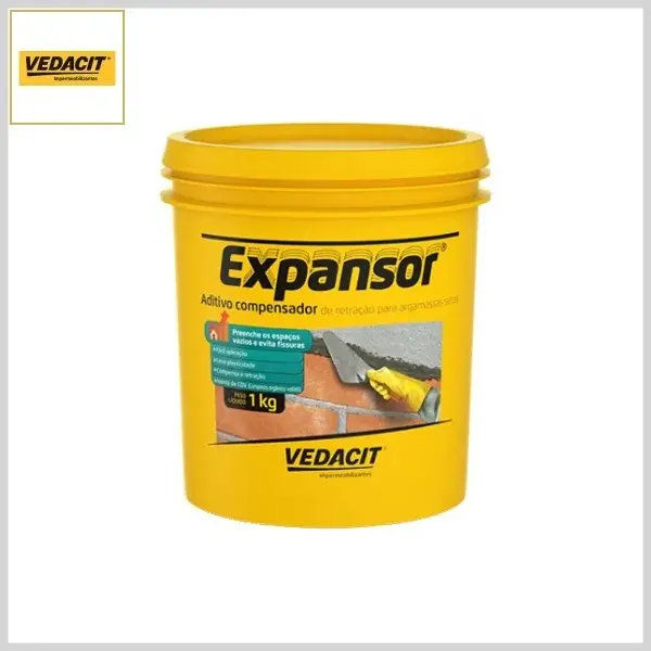 Expansor é um aditivo compensador de retração para argamassas secas. Sua ação compensa e impede a retração natural das argamassas, evitando fissuras. Preenche totalmente os espaços vazios, o que facilita sua aplicação em frestas e locais confinados.