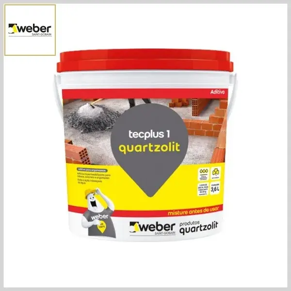 Tecplus 1 Quartzolit é um aditivo líquido impermeabilizante, de cor branco leitoso, para concreto e argamassas que, quando é adicionado à água de amassamento, proporciona a redução da permeabilidade, evitando a umidade e infiltração de água na argamassa, aumentando sua coesão para melhor trabalhabilidade.