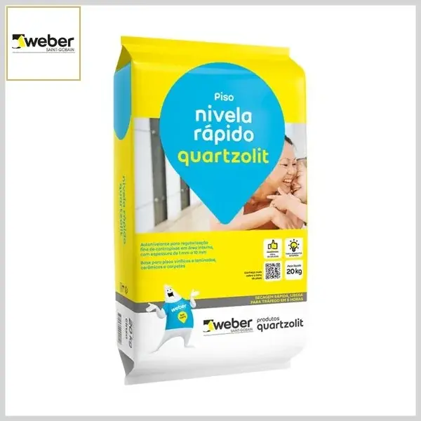 Nivela rápido Quartzolit é uma argamassa autonivelante, de secagem rápida, para recuperação e nivelamento de contrapisos e lajes de concreto para pisos laminados, vinílicos, cerâmicas e pedras, destinado para o tráfego de pessoas.