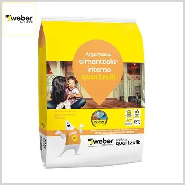 Cimentcola interno Quartzolit é uma argamassa colante , de secagem rápida, indicada para assentamento de cerâmicas em pisos e paredes internas tipo ACI (NBR 14.081) com até 80x80cm de tamanho.