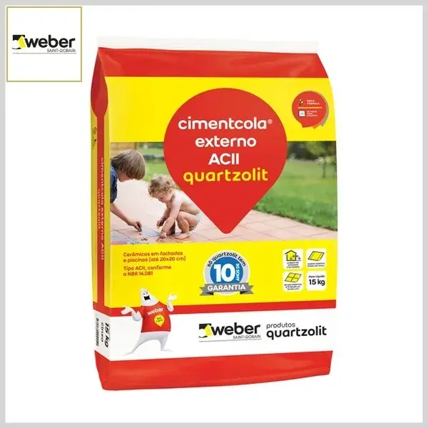 Cimentcola externo Quartzolit é uma argamassa colante , de secagem rápida, indicada para assentamento de cerâmicas e placas de pedra naturais em pisos e paredes internas ou externas tipo ACII (NBR 14.081) com até 80x80cm de tamanho ou até 20x20cm em fachadas.