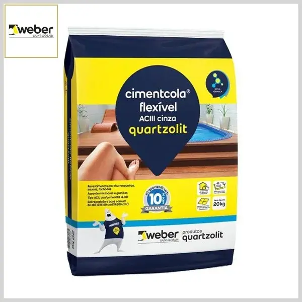 Cimentcola flexível cinza Quartzolit é uma argamassa colante de secagem rápida, desenvolvida para a sobreposição e assentamento de cerâmicas, porcelanatos, mármores, granitos e pedras naturais de uso interno ou externo tipo ACIII (NBR 14.081), sendo indicada para revestimentos de churrasqueiras, piscinas, saunas, pisos e paredes com peças de até 60x60cm em fachadas, até 120x120cm nas sobreposições ou até 140x140cm nas bases comuns.