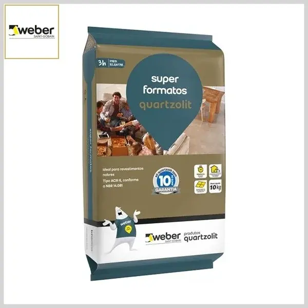 Super formatos Quartzolit é uma argamassa colante branca, de secagem super rápida, desenvolvida para a sobreposição e assentamento de porcelanatos cerâmicos, mármores, granitos e pedras naturais de uso interno ou externo tipo ACIII-E (NBR 14.081), sendo indicada para revestimentos de até 200x200cm em piscinas, saunas, pisos e paredes ou peças de até 60x60cm em fachadas.