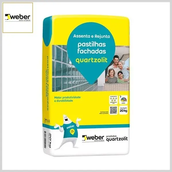 Pastilhas fachadas Quartzolit é uma argamassa colante, disponível em 7 cores, desenvolvida para assentamento e rejuntamento simultâneo, com acabamento liso, de pastilhas de porcelana em fachadas.