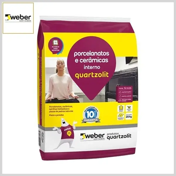 Porcelanato e cerâmicas interno Quartzolit é uma argamassa colante de base cimentícia, ideal para assentamento de porcelanatos, cerâmicas, ladrilhos hidráulicos e placas de pedras naturais com até 100x100cm, em áreas internas.