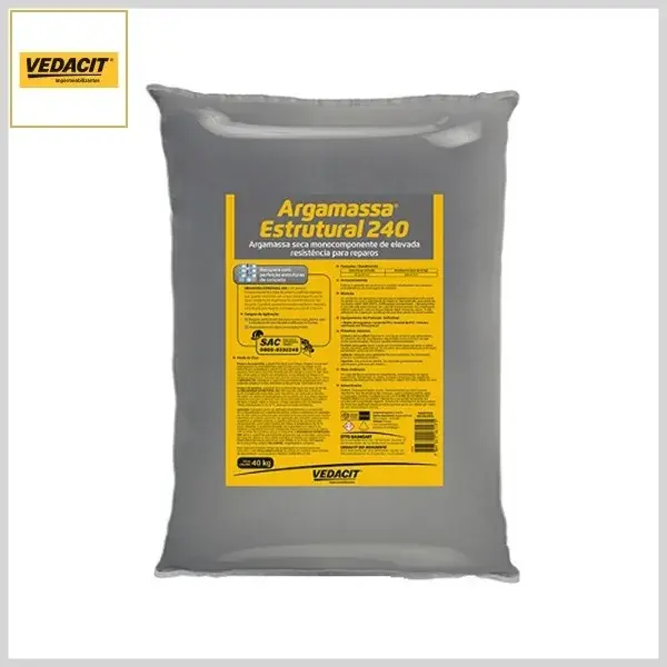 Argamassa Estrutural 240 é um produto monocomponente à base de cimento e aditivos especiais, que quando misturado com a quantidade especificada de água resulta numa argamassa de consistência seca, tipo dry-pack. O produto apresenta elevada resistência mecânica e é indicado para reparos com espessuras de 3 a 7cm.