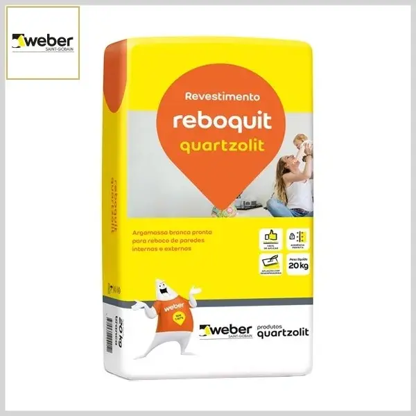Reboquit Quartzolit é uma argamassa branca composta de cal e agregados, indicada para revestimento de acabamento sobre paredes e tetos internos e externos, previamente rebocados.