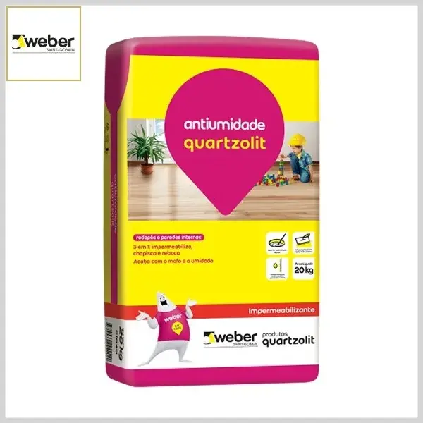 Antiumidade Quartzolit é uma argamassa pronta de base cimentícia, ideal para impermeabilização e recuperação de paredes e rodapés, sendo indicada para revestir paredes em áreas internas e externas, além de pequenos reparos e reformas em geral.