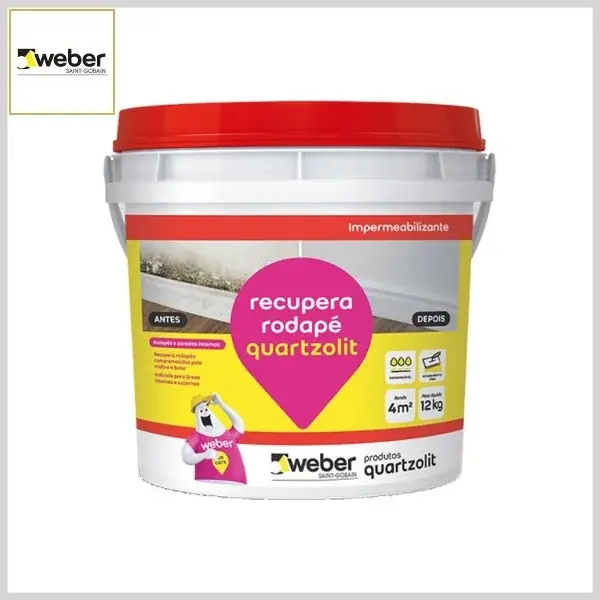 Recupera rodapé Quartzolit é uma argamassa polimérica pronta de base cimentícia, ideal para impermeabilização e recuperação de paredes e rodapés comprometidos pela umidade com sinais de mofo ou emboloradas, podendo também ser utilizada como argamassa de acabamento para receber pintura, em ambientes internos ou externos.