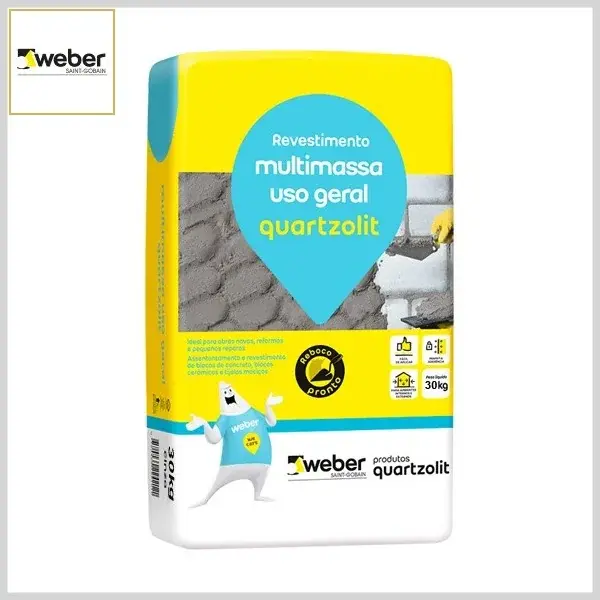 Multimassa uso geral Quartzolit é uma argamassa pronta, indicada para assentamento de blocos de concreto, blocos celulares, blocos cerâmicos, tijolos de barro e para revestimentos de tetos, paredes e muros de alvenaria em geral.