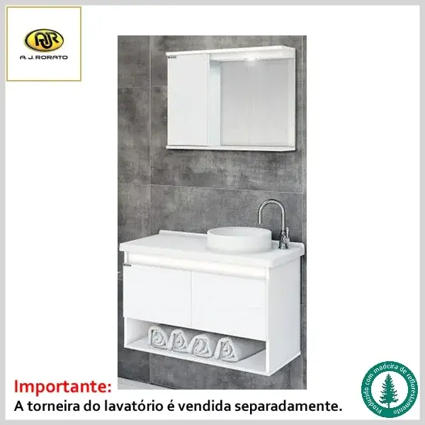 Produto com gabinete, frente de porta em MDP, prateleira interna, nicho inferior, frontão e espelheira confeccionados em MDP com pintura UV laqueado de fácil limpeza. O kit é fornecido com dobradiças metálicas com amortecimento, pia de mármore sintético, espelheira com vidro e lâmpada led bivolt.