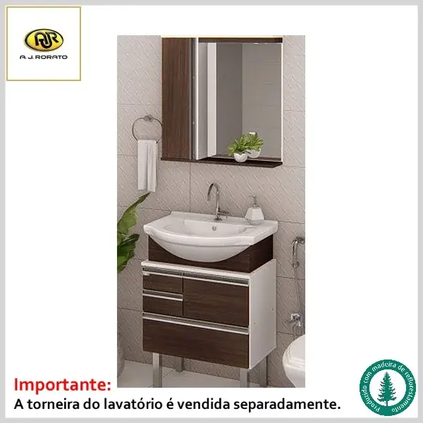 Produto com gabinete, frentes de gavetas, portas, frontão e espelheira confeccionados em MDP-BP 15mm madeirado com lâmina melamínica de maior resistência à umidade e de fácil limpeza. O kit é fornecido com puxadores em perfil de alumínio embutidos, corrediças telescópicas, dobradiças com amortecedor, pia de louça com válvula tipo click-up e espelheira com vidro e luminárias com lâmpadas Led bivolt.