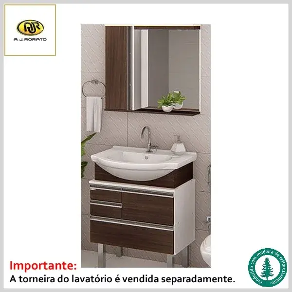 Produto com gabinete, frentes de gavetas, portas, frontão e espelheira confeccionados em MDP-BP 15mm madeirado com lâmina melamínica de maior resistência à umidade e de fácil limpeza. O kit é fornecido com puxadores em perfil de alumínio embutidos, corrediças telescópicas, dobradiças com amortecedor, pia de louça com válvula tipo click-up e espelheira com vidro e luminárias com lâmpadas Led bivolt.