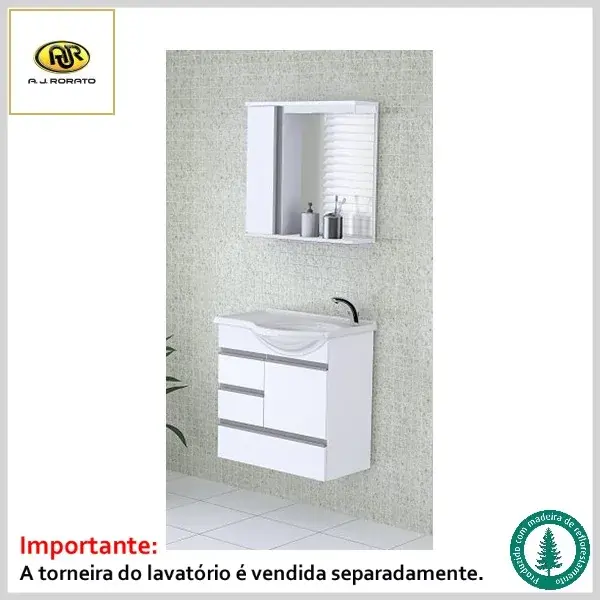 Armário de Banheiro Florence 59.5cm Mdp 5570 1Porta+3Gavetas Suspenso c/Espelho+Pia - Branco - AJ Rorato