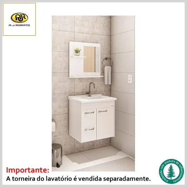Produto com gabinete, frente de portas, gavetas, frontão e espelheira confeccionados em MDP com pintura UV laqueado de fácil limpeza. O kit é fornecido com puxadores em ABS tipo alça, corrediças e dobradiças metálicas reforçadas, pia de mármore sintético e espelheira com vidro e prateleiras.