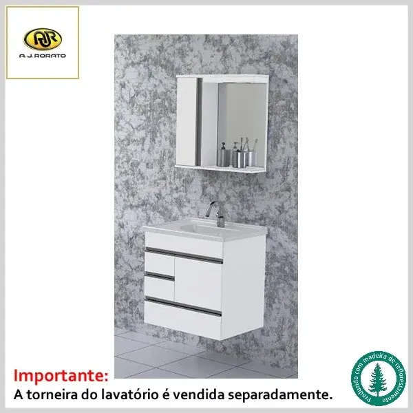 Armário de Banheiro Módena 59.5cm Mdp 5578 1Porta+3Gavetas Suspenso c/Espelho+Pia - Branco - AJ Rorato