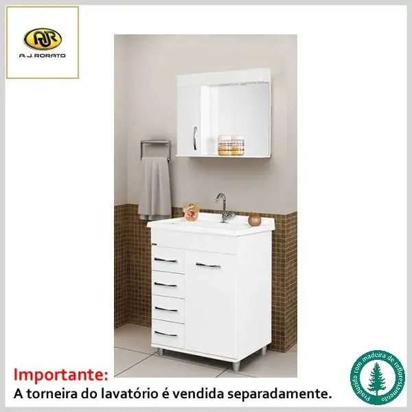 Armário de Banheiro Mônaco 59.5cm Mdp 5714 1Porta+4Gavetas Apoiado c/Espelho+Pia - Branco - AJ Rorato