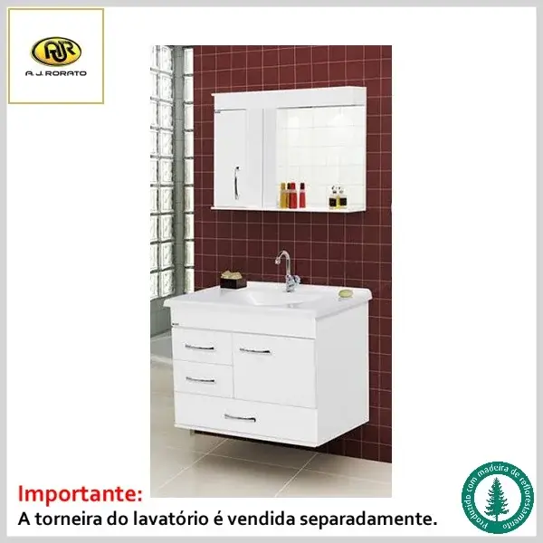 Armário de Banheiro Mônaco 79.5cm Mdp 5709 1Porta+3Gavetas Suspenso c/Espelho+Pia - Branco - AJ Rorato