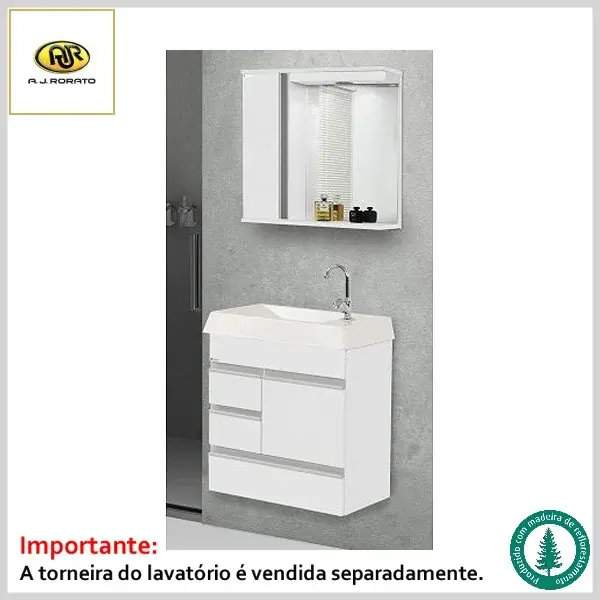 Armário de Banheiro Nápole 59.5cm Mdp 5220 1Porta+3Gavetas Suspenso c/Espelho+Pia - Branco - AJ Rorato