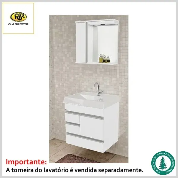 Armário de Banheiro Nápole 59.5cm Mdp 5221 1Porta+3Gavetas Suspenso c/Espelho+Pia - Branco - AJ Rorato