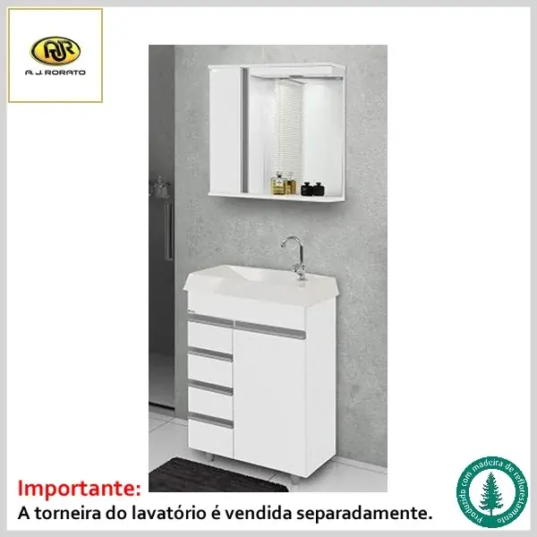 Armário de Banheiro Nápole 59.5cm Mdp 5236 1Porta+4Gavetas Apoiado c/Espelho+Pia - Branco - AJ Rorato