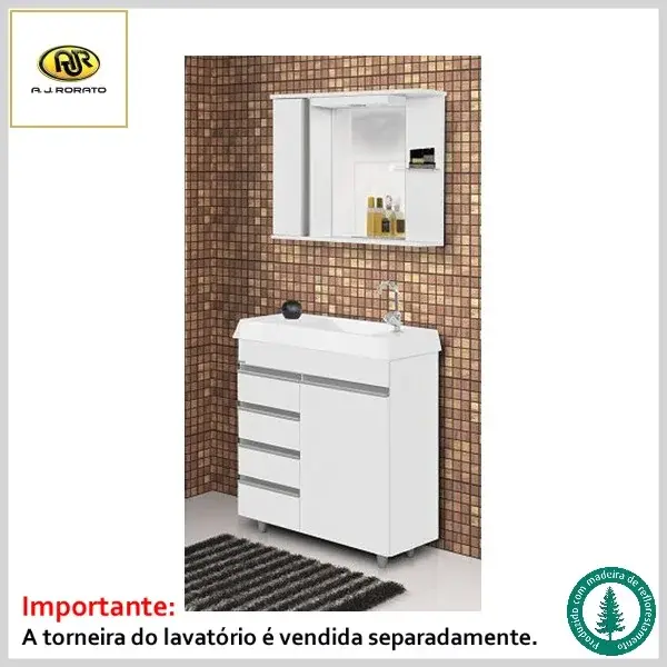 Armário de Banheiro Nápole 79.5cm Mdp 5238 1Porta+4Gavetas Apoiado c/Espelho+Pia - Branco - AJ Rorato