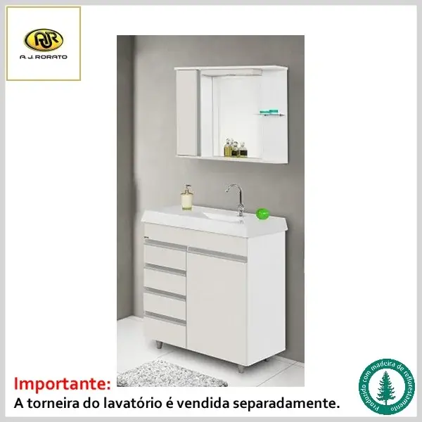 Armário de Banheiro Nápole 79.5cm Mdp 5239 1Porta+4Gavetas Apoiado c/Espelho+Pia - Branco - AJ Rorato
