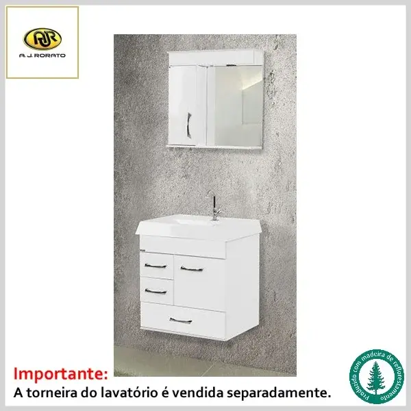 Armário de Banheiro Pádua 59.5cm Mdp 5991 1Porta+3Gavetas Suspenso c/Espelho+Pia - Branco - AJ Rorato