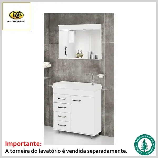 Armário de Banheiro Pádua 79.5cm Mdp 5250 1Porta+4Gavetas Apoiado c/Espelho+Pia - Branco - AJ Rorato
