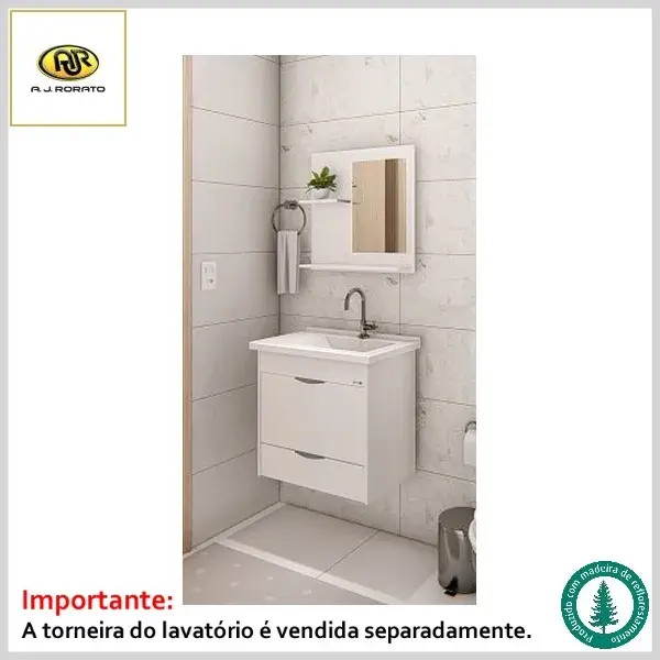 Produto com gabinete, frente de portas, gavetas, frontão e espelheira confeccionados em MDP com pintura UV laqueado de fácil limpeza. O kit é fornecido com puxadores em ABS tipo alça, corrediças e dobradiças metálicas reforçadas, pia de mármore sintético e espelheira com vidro e prateleiras.