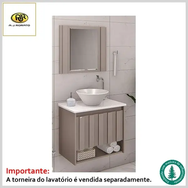 Produto com gabinete, frente de porta ripada, gaveta de correr interna, nicho inferior, frontão e espelheira confeccionados em MDP com pintura UV laqueado de fácil limpeza. O kit é fornecido com puxadores em ABS tipo alça, corrediças e dobradiças metálicas reforçadas, tampo de mármore sintético, cuba cônica e espelheira com vidro e laterais ripadas.
