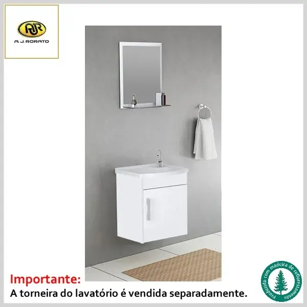 Produto com gabinete e frontão confeccionados em MDP madeirado e porta em textura branca com acabamento em lâmina melamínica de fácil limpeza. O kit é fornecido com puxador em ABS padrão prata fosco, dobradiças metálicas, pia de mármore sintético e espelheira com prateleira de vidro e moldura na cor branca.