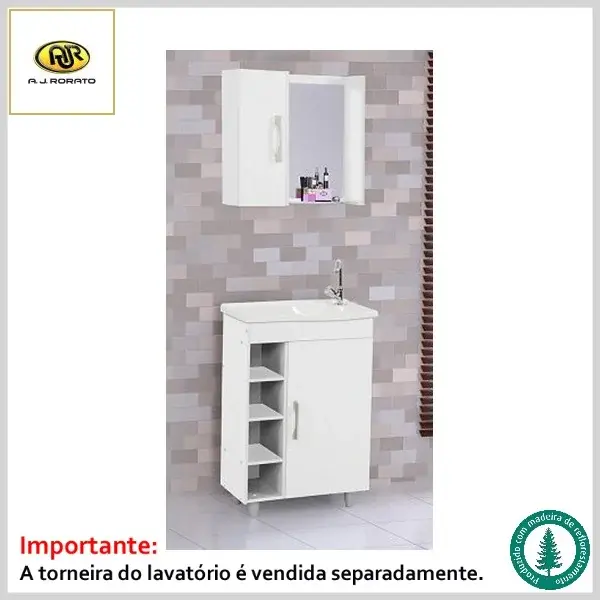 Produto com gabinete, nichos e frontão confeccionados em MDP madeirado e portas em textura branca com acabamento em lâmina melamínica de fácil limpeza. O kit é fornecido com 4 pés e puxadores em ABS padrão prata fosco, dobradiças metálicas, pia de mármore sintético e espelheira com prateleira de vidro e moldura e lateral no padrão do gabinete.