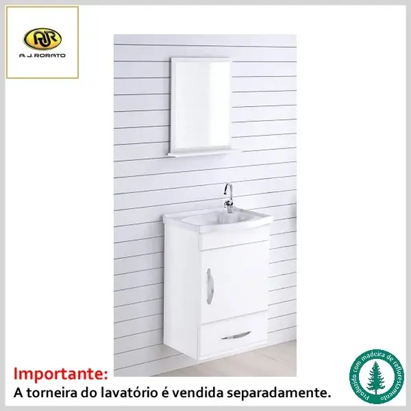 Produto com gabinete, frente de porta, gaveta, frontão e espelheira confeccionados em MDF com pintura UV laqueada brilhante de fácil limpeza. O kit é fornecido com puxadores em ABS tipo alça, dobradiças metálicas, pia de mármore sintético e espelheira com vidro.