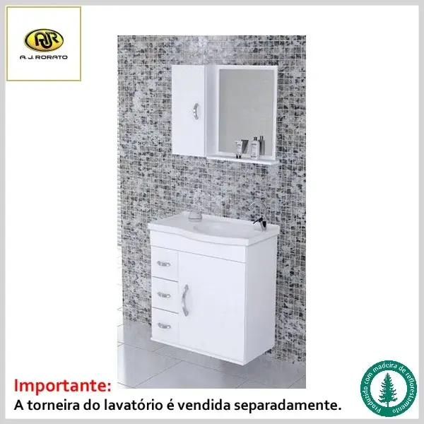 Armário de Banheiro Verona 55.5cm Mdf 5789 1Porta+3Gavetas Suspenso c/Espelho+Pia - Branco - AJ Rorato