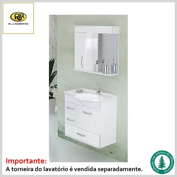 Armário de Banheiro Viena 59.5cm Mdf 5700 1Porta+3Gavetas Suspenso c/Espelho+Pia - Branco - AJ Rorato