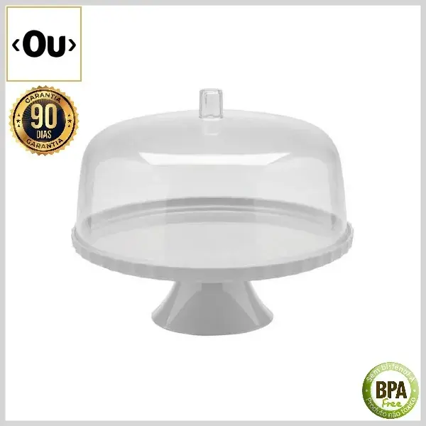 Bandeja para Bolos Break Redonda Plástico BpaFree Polipropileno c/Cúpula, 25cm c/Pé - Branco - Ou
