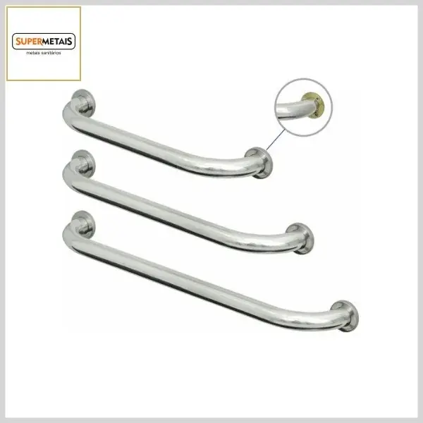 Produto com corpo em tubo de alumínio 1.1/4" polido, base em latão e parafusos de fixação em aço inox, sendo indicado para uso como apoio em boxes de banho e para banheiros de deficientes, com capacidade máxima de carga de até 150kg.