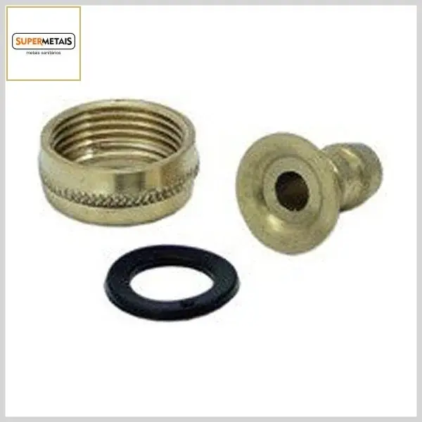 Produto com corpo metálico amarelo, sendo indicado para acoplamento em torneiras com saídas de rosca 3/4pol. Acompanha anel para vedação do conjunto.