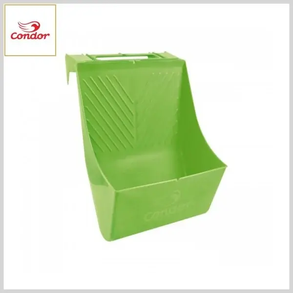 CAÇAMBA CONDOR 999 foi projetada para facilitar o trabalho do pintor. Com exclusivo pendurador para escada, ela sempre fica à mão, otimizando o trabalho, além de também poder ser colocada diretamente no chão. Com dimensões de 407x276x150mm (altura x largura x profundidade), possui capacidade para 3,6 litros de tinta, equivalente a 1 galão. Na côr verde, possui suporte para trinchas e local para remover o excesso de tinta, sendo indicada para utilização com rolos de pintura com até 23 cm.